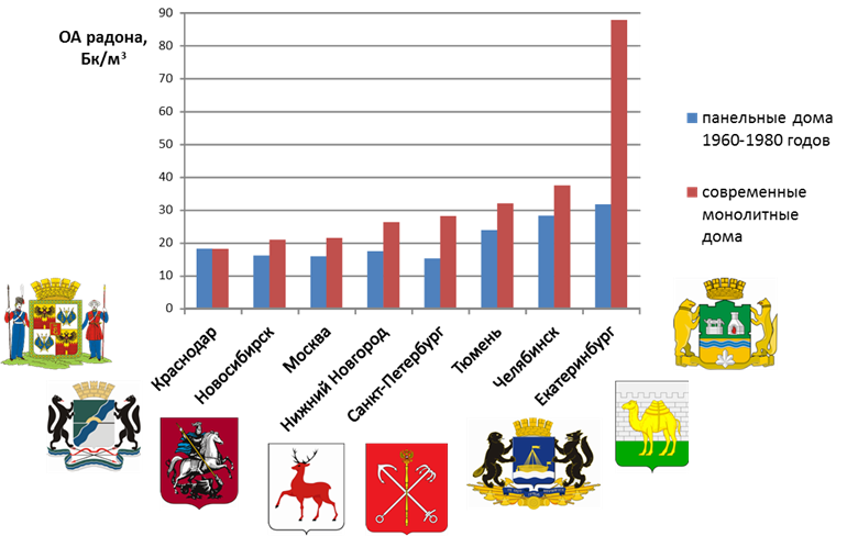 1. На основе масштабного радонового обследования, выполненного в восьми крупных городах России с применением единого методологического подхода, впервые сделана обоснованная оценка облучения радоном городского населения страны: средняя объемная активность (ОА) радона в многоэтажных зданиях 25 Бк/м3; среднее геометрическое – 21 Бк/м3; геометрическое стандартное отклонение – 1,8; доля жилищ с ОА радона выше 100 Бк/м3 – 0,42%. В целом облучение радоном в многоэтажных городских зданиях России является невысоким. В новых зданиях повышенного класса энергоэффективности ОА радона увеличивается в среднем в 1,5 раза, доля зданий с ОА радона выше 100 Бк/м3 возрастает до 2,8%. Использование строительных материалов с более высокой удельной активностью (УА) Ra-226 приводит к существенному росту ОА радона в жилищах. При УА Ra-226 выше 90 Бк/кг и низкой кратности воздухообмена в жилых помещениях современных зданий может превышаться норматив по ОА радона. Разработаны базовые принципы снижения содержания радона