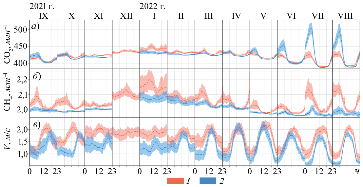 Рис. Помесячный среднесуточный ход концентраций СО2 (а) и CH4 (б), а также скорости горизонтального ветра (в) в пунктах мониторинга Екатеринбурга (1) и КАО (2). Полутона – 95%-ный доверительный интервал для средних значений.