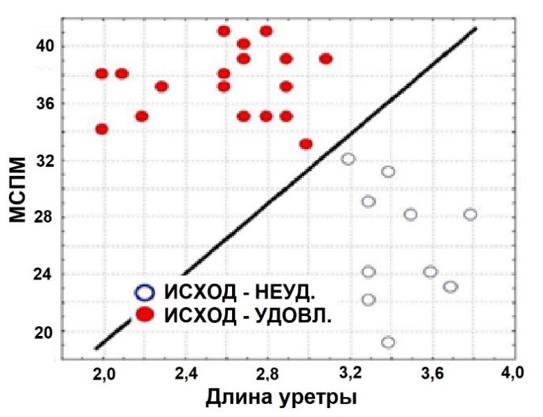 Рис. Показатели «Длина уретры» и «Максимальная скорость потока мочи-МСПМ» для пациенток, удовлетворенных и неудовлетворенных результатом операции ГЕЛЬ. Линия на графике – прогностическое правило.