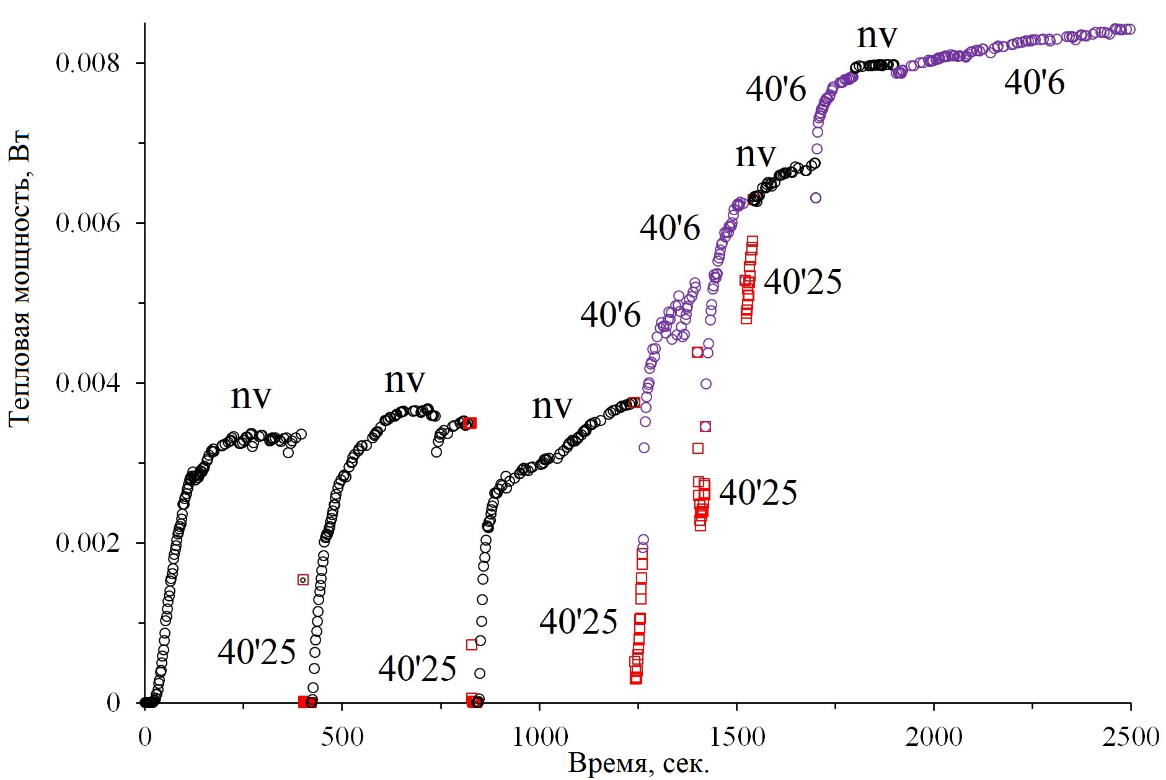 Рис. Изменение мощности в образце со временем при отсутствии и наличии вибраций. Цвет соответствует типу вибрации: отсутствие вибрации (nv) – черный цвет, возмущающие 40’6 (частота 40 Гц, амплитуда 6 м/с2) и разрушающие 40’25 (частота 40 Гц, амплитуда 25 м/с2) вибрации – фиолетовый и красный цвет, соответственно.