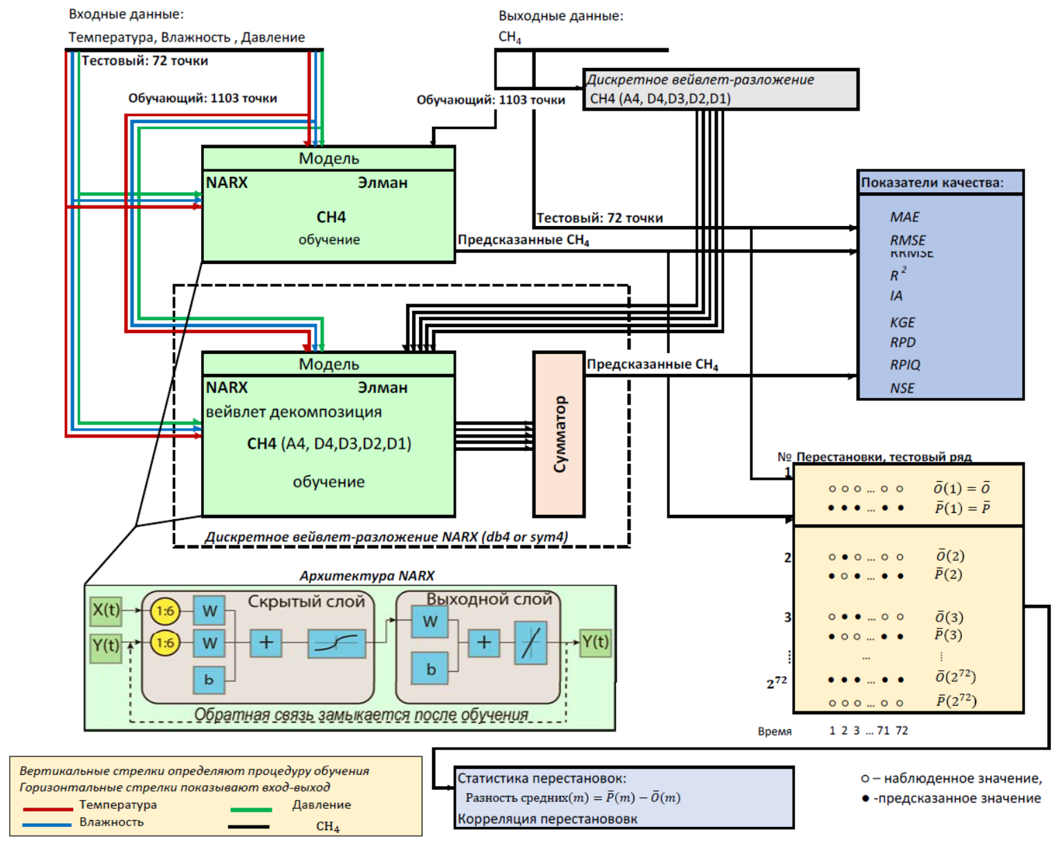 7. Пермутационный метод оценки точности прогноза временного ряда. Разработаны принципы применения пермутационного подхода для оценки эффективности прогностических моделей распределений примесей в окружающей среде. На примере динамики приземной концентрации парникового газа метана на арктическом острове Белый продемонстрированы преимущества пермутационного подхода при построении моделей, комбинирующих нейросети Elman и NARX с предварительной дискретной вейвлет-декомпозицией, наблюдаемой реализации временного ряда, на основе вейвлетов Daubechies (db4) и Symlet (sym4).