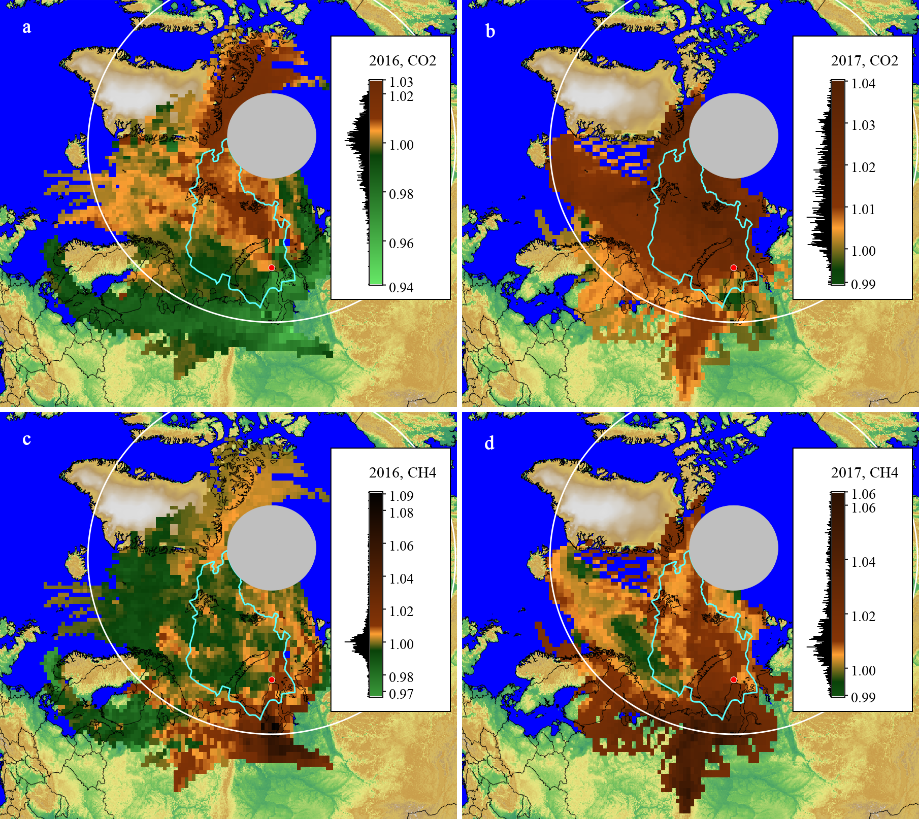 9. На основе результатов измерений концентраций парниковых газов в летние месяцы на острове Белый с использованием вычислительной технологии пассивной ветровой локации атмосферы (метод флюид-локации атмосферы) получены карты распределений в тропосфере Карского и северной части Баренцева морей средних эффективных концентраций метана и диоксида углерода (последний впервые). Показано, что в летние месяцы наблюдалось существенное перераспределение указанных парниковых газов между континентом и акваторией морей. Для диоксида углерода средние летние концентрации над континентом меньше, чем над поверхностью моря, для метана зафиксирована обратная тенденция.