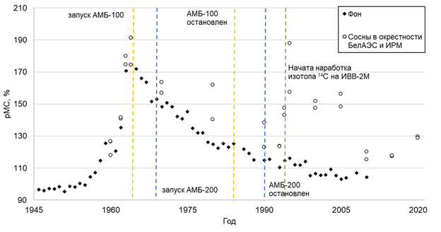 2. Разработана оригинальная методика проведения радиоэкологического исследования в районах расположения объектов использования атомной энергии (ОИАЭ) на основе измерения радиоуглерода (С-14) в годичных кольцах сосны с применением ускорительной масс-спектрометрии. На основании предложенного подхода исследован вклад выбросов ядерных реакторных установок ОИАЭ (ИВВ-2М, АМБ-100 и АМБ-200) в содержание С-14 в растительности в г. Заречный. Показано, что за счет выбросов концентрация C-14 в различных годичных кольцах сосны увеличивалась до 35 pMC (процент современного углерода). Предложенный метод позволяет ретроспективно оценить выбросы С-14 на всем жизненном цикле реакторной установки, в том числе в течение отдельных проводимых технологических процессов и топливных кампаний.