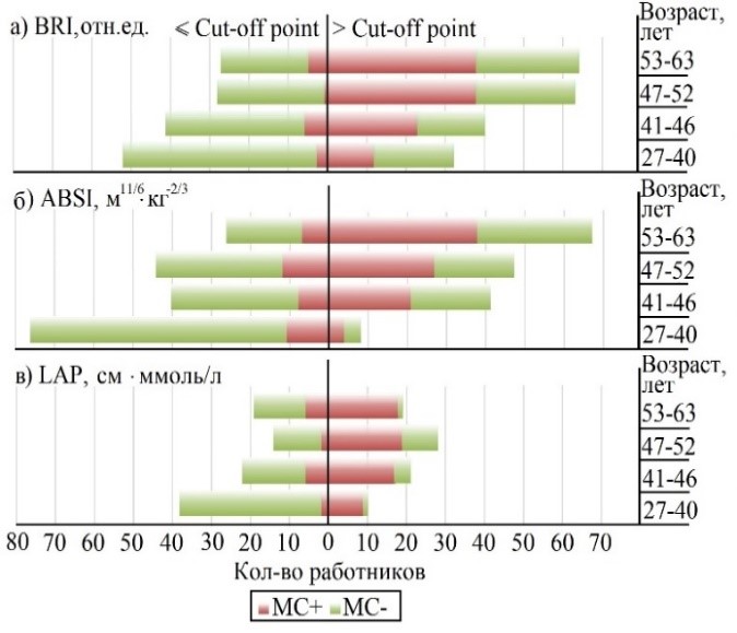 Рис. Распределение численности работников по возрастным группам и наличию МС с разбивкой антропометрических показателей по полученным пороговым значениям.