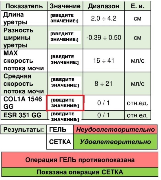 5. Моделирование исхода оперативного лечения недержания мочи. Разработан способ прогнозирования эффективности двух типов операций у женщин со спонтанным недержанием мочи (СНМ) в постменопаузе: 1) парауретральное введение объемообразующего геля в сочетании с пластикой цистоцеле собственными тканями (тип ГЕЛЬ); 2) передняя кольпоррафия в сочетании с уретропексией свободной синтетической петлей (тип СЕТКА). Дискрминантный анализ 60 клинических показателей (по данным ультразвукового исследования и определения полиморфизмов генов) и первичного клинического материала по результатам выполнения операций типа ГЕЛЬ и СЕТКА позволил выделить комплекс наиболее существенных показателей. Применение способа позволяет предложить персонифицированный метод хирургического лечения недержания мочи, который снижает процент ошибочного выбора типа операции с 20-30% до 1-2%. Предложенный подход реализован в программном обеспечении, используемом в практической медицине.