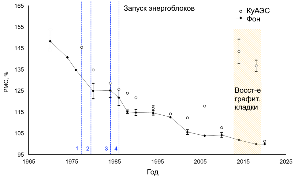 Рис. Удельная активность 14С в годичных кольцах деревьев в районе Курской АЭС (100 pMC = 226 Бк/кг С). Измерения проведены с помощью ускорительного масс-спектрометра в ИЯФ им. Будкера СО РАН.