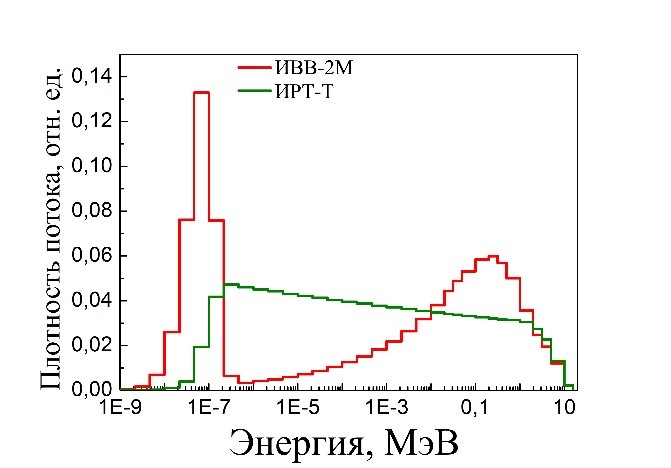 Рис. Энергетическое распределение плотности потока нейтронного излучения в аналогичных точках реакторных установок ИРТ-Т и ИВВ-2М: а) отм. 8,05 (крышка бака аппарата); б) отм. 3,9 (за биологической защитой реактора);