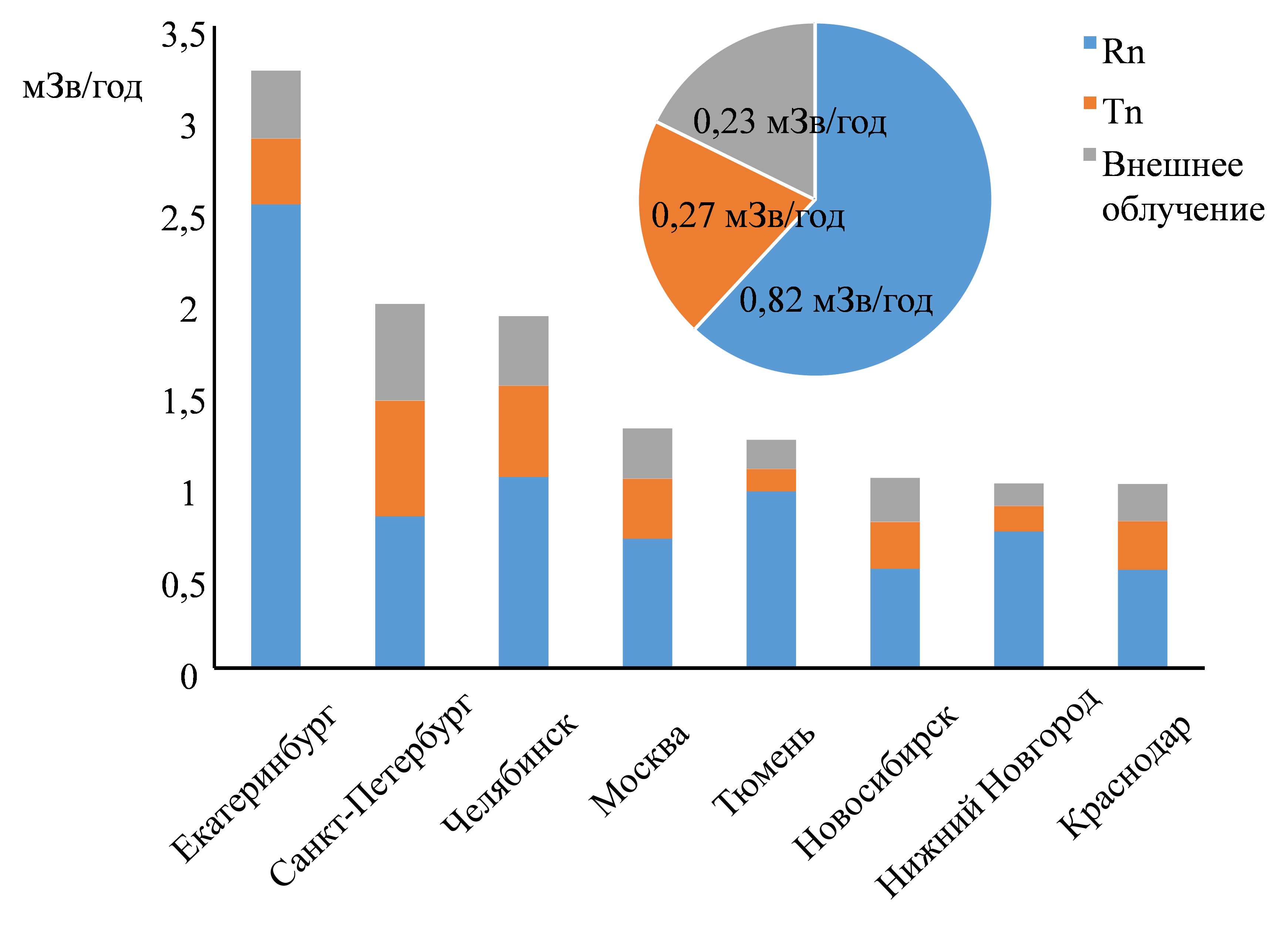 Рис. Вклад источников ионизирующего излучения, связанных с природными радионуклидами в строительных материалах, в эффективную дозу облучения городского населения, проживающего в многоэтажных зданиях, возведенных после 2000 г. (по городам – столбики, в среднем по России – круговая диаграмма).
